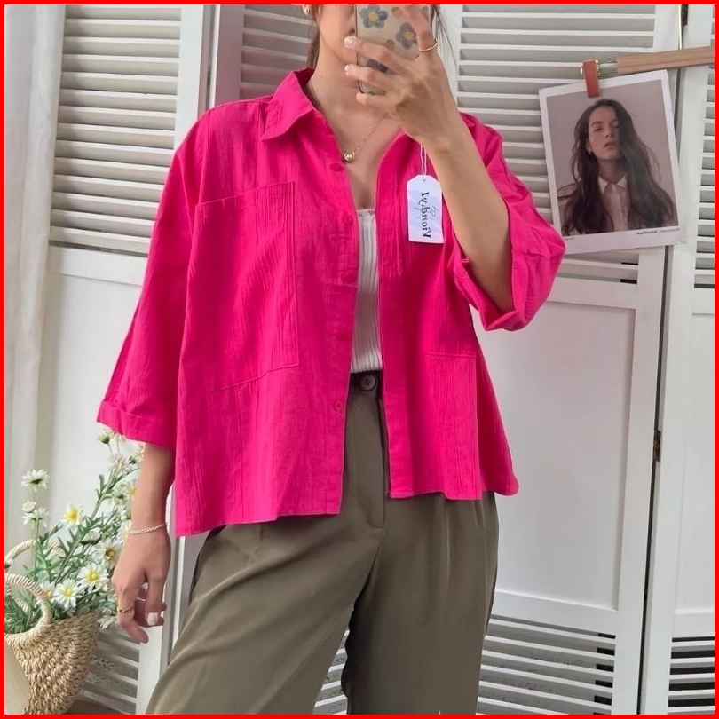 Kemeja Kantong Baru Kemeja Linen Atasan Wanita Korean Style