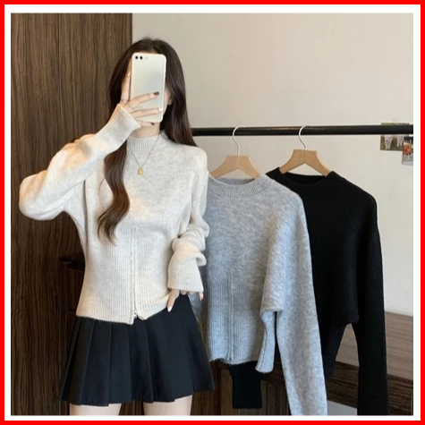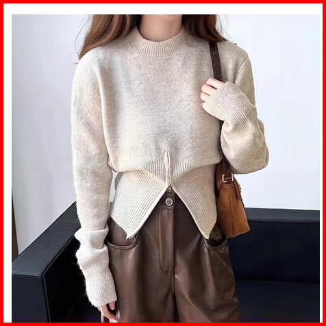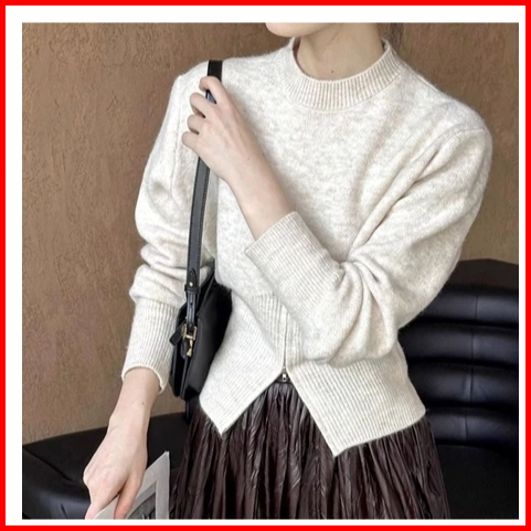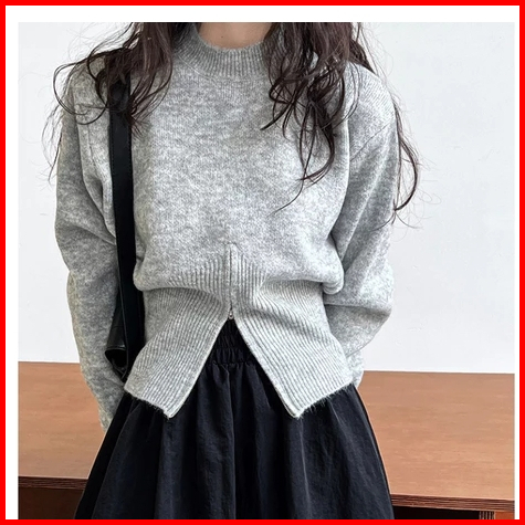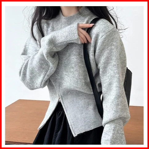 Niche Pakaian Rajut Serbaguna Sweater Crop Solid Longgar Pakaian Rajut Lengan Panjang Ritsleting Wanita