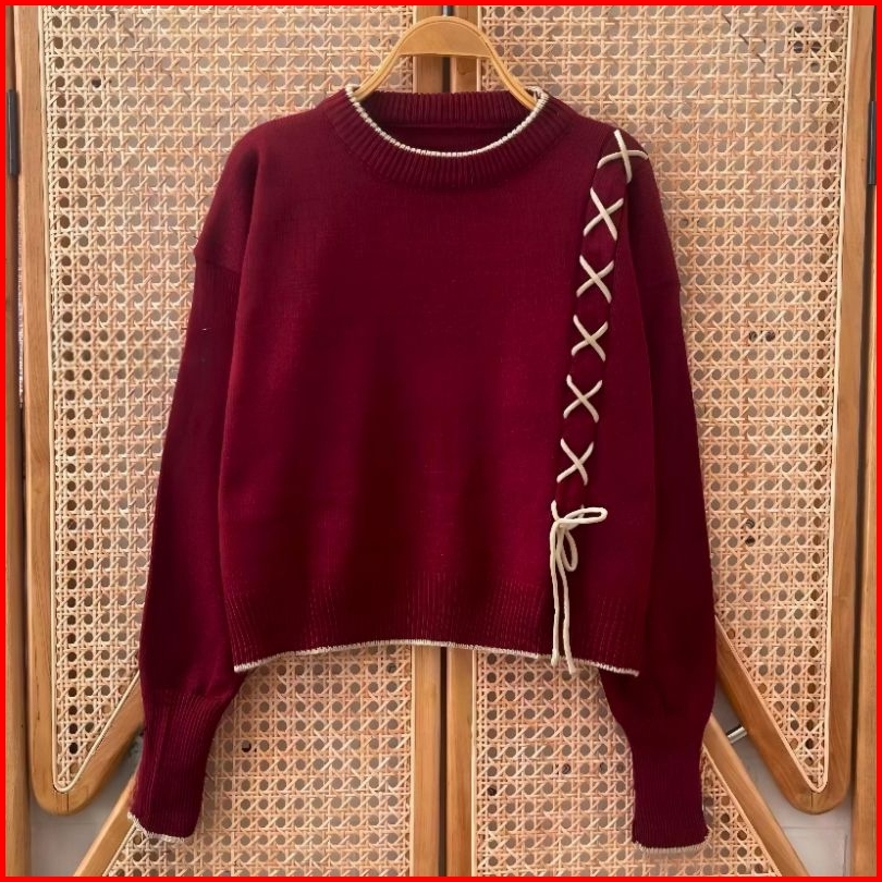 Blouse Sweater Knit Rajut Tali Pita Lengan Panjang Wanita Korea Atasan Seweater Rajut Wanita Tali Kur Style Korean