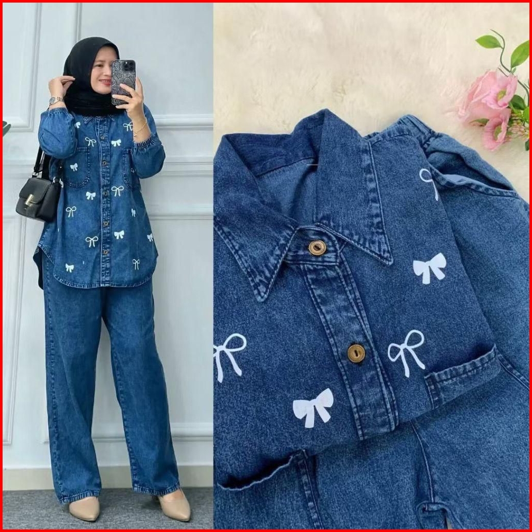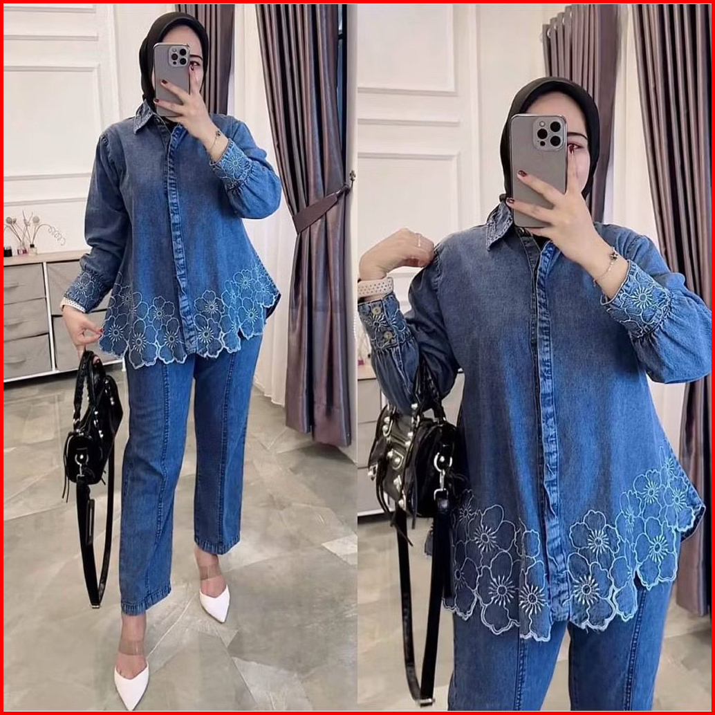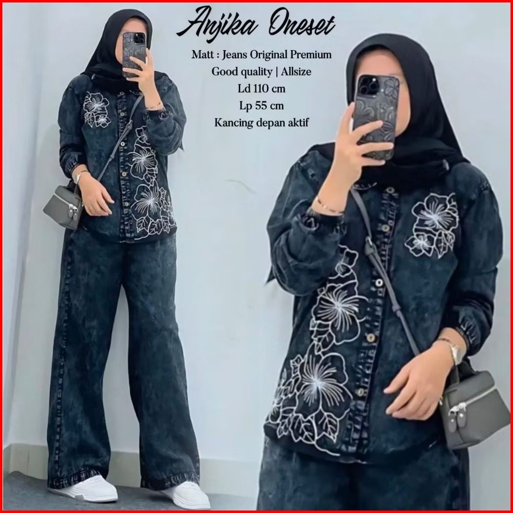 Zava Set Anjika Oneset Mudra Set 3 Pita Oneset Setelan Jeans Bordir Kancing Hidup
