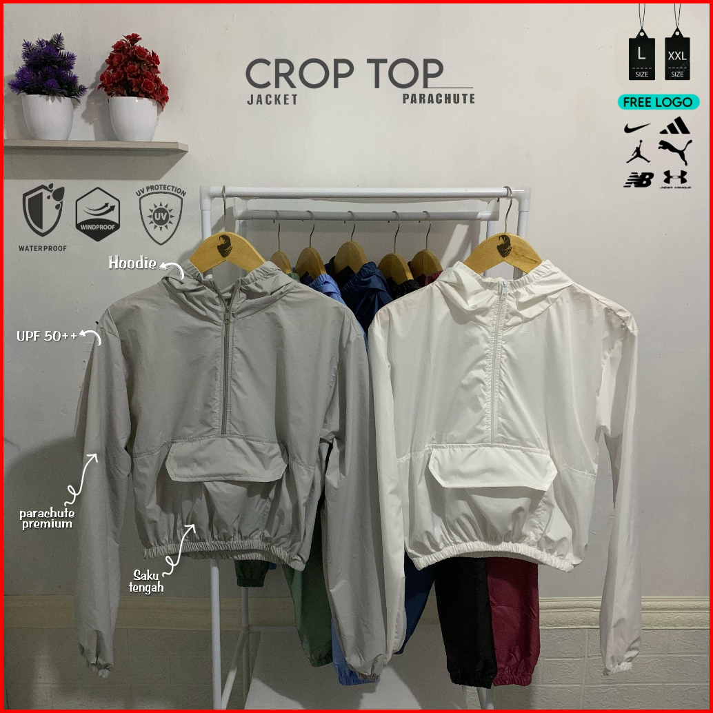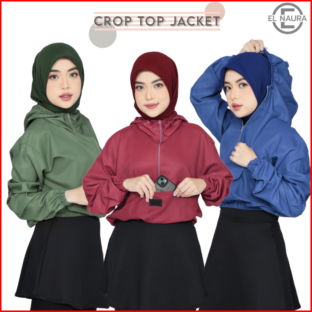 Jaket Olahraga Wanita Crop Top Saku Parasut Hoodie Waterproof Anti Uv Senam Aerobic