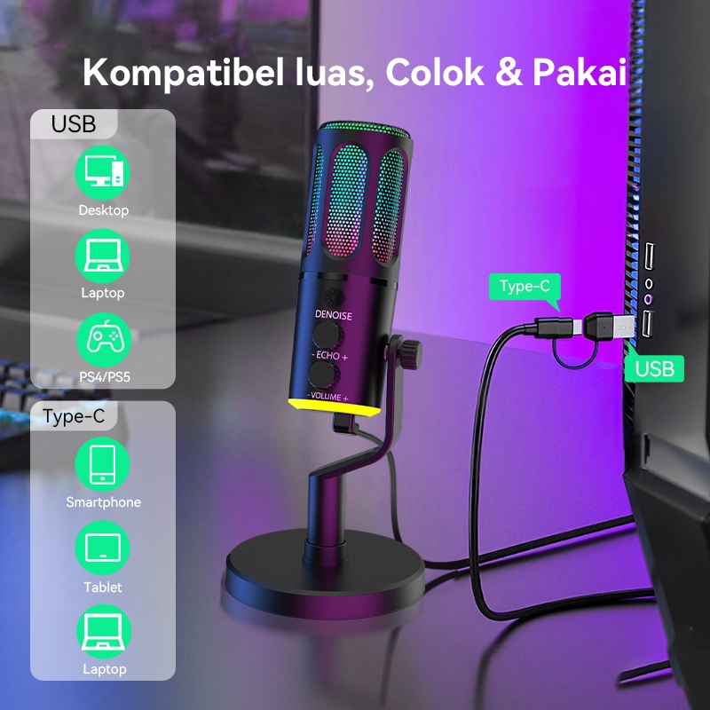 Rgb Microphone Condenser Usb Type-C Mikrofon With Rgb Dynamic Mic For Pc Laptop Streaming Gaming Recording Mic