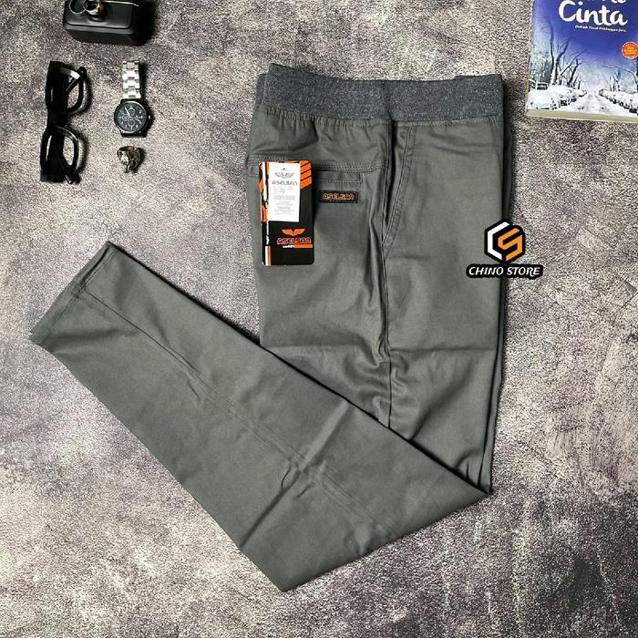 Celana Chinos Panjang Pria Dewasa Rib Pinggang Karet Bahan Melar Elastis Kain Katun Twill Combed Stretch Cowok Kerja Sa