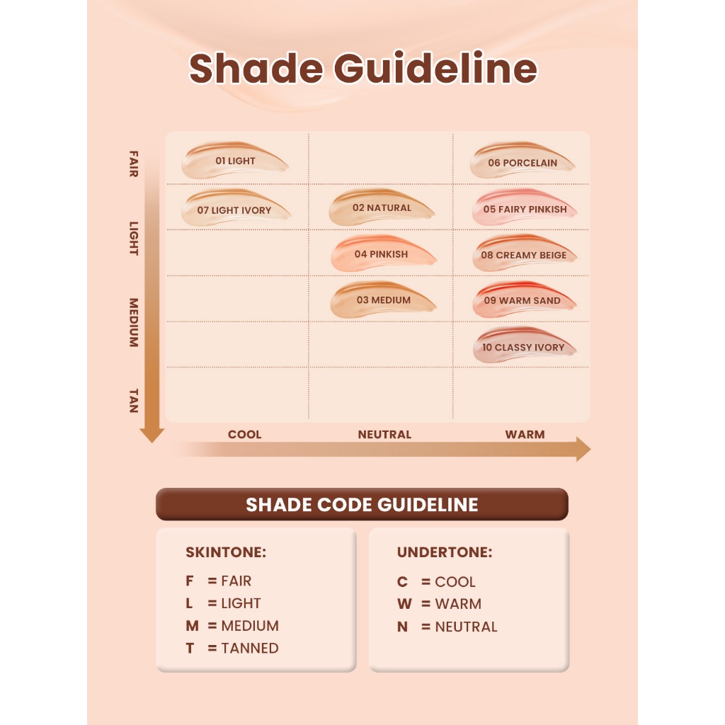 01 Light, 02 Natural, 03 Medium, 04 Pinkish, 05 Fairy Pinkish, 06 Porcelain, 07 Light Ivory, 08 Creamy Beige, 09 Warm Sand, 10 Classic Ivory