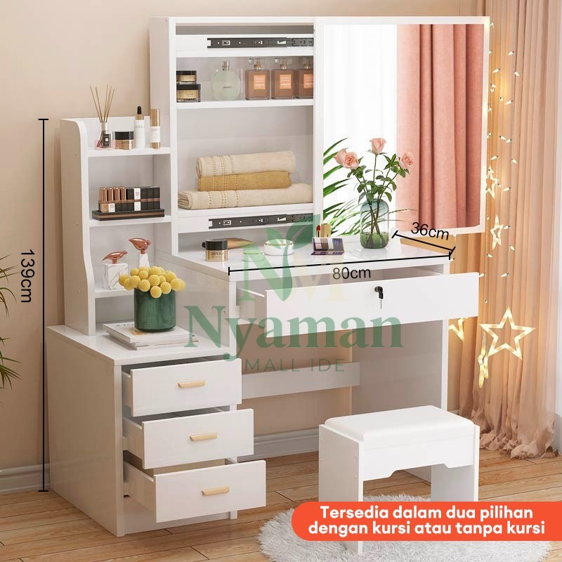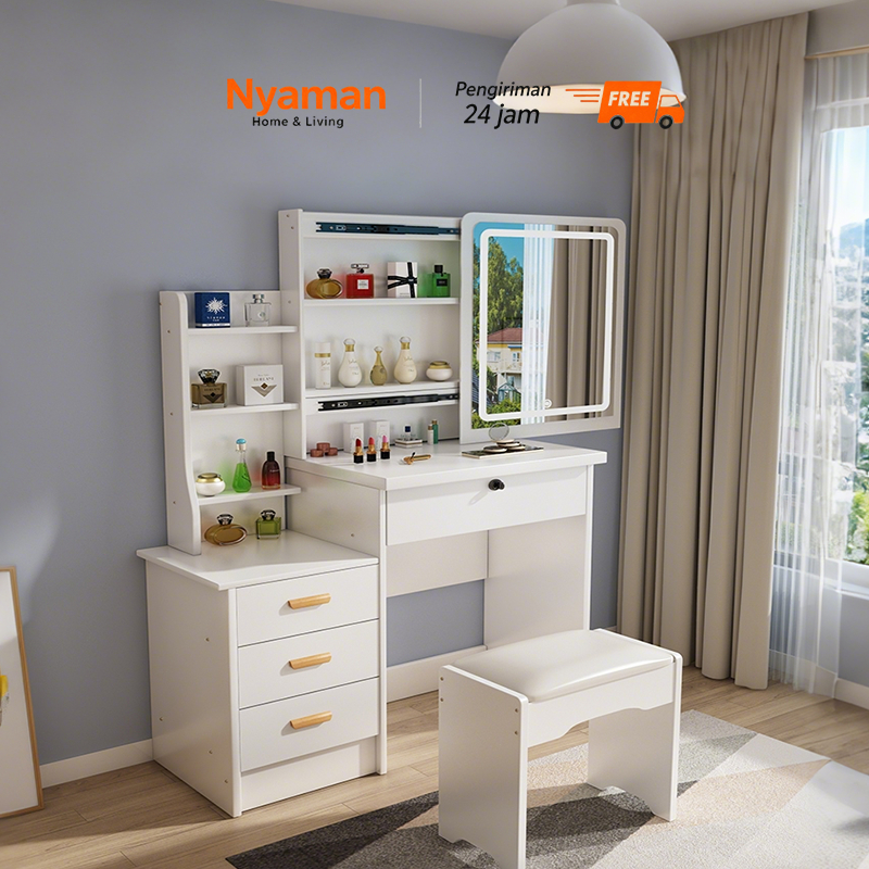 NYAMAN Meja Rias Simpel Dan Cantik Dengan Lampu Rias Led Terang Dan Pintu Cermin Geser Built-In