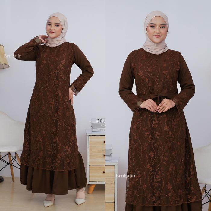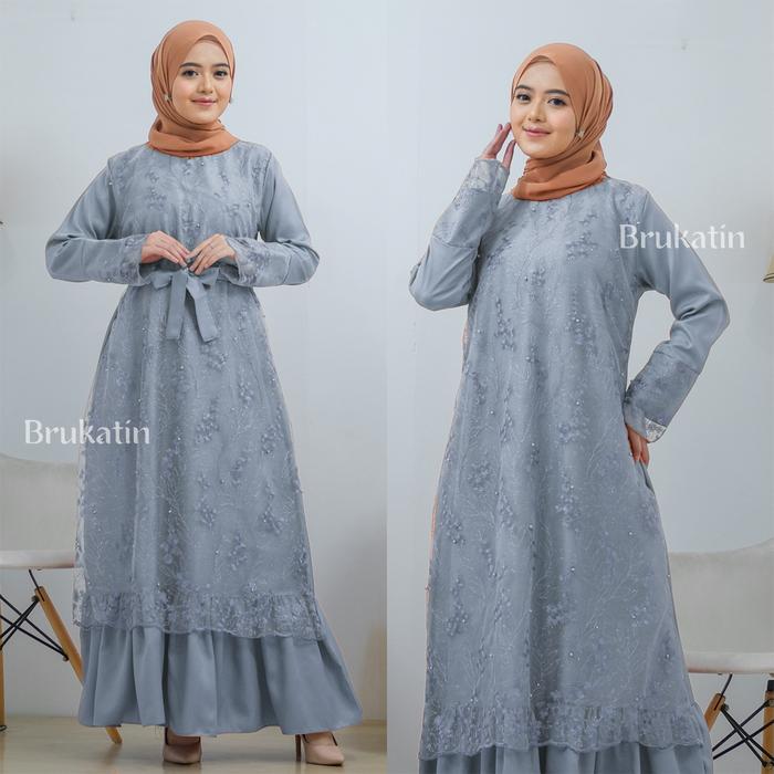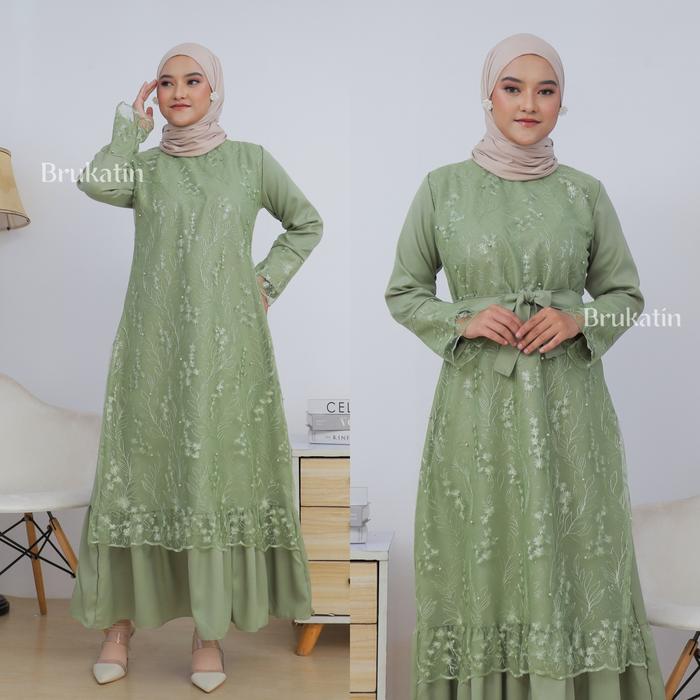Gamis Brukat Pramitha Dress Brokat Baju Pesta Tile Brukat Mutiara Gaun Kondangan Pesta Pernikahan Lebaran - Hijau Sage,