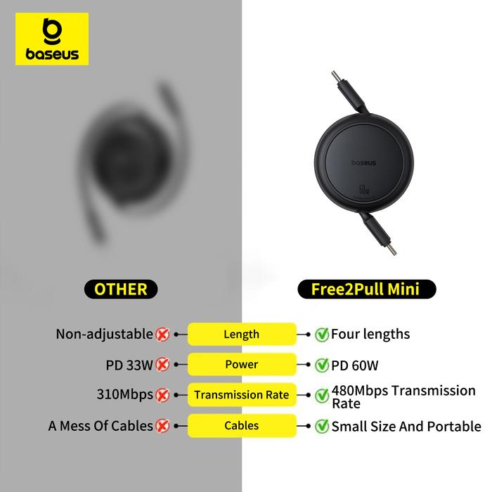 Top Product Baseus Free2Pull Mini Charging Cable 60W Type-C To Type-C Charger Kabel Data Handphone Laptop Fast Chargin