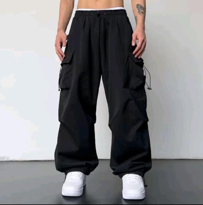 Celana Cargo Pria Model Terbaru Highwaist Korean Stail Casual Dengan Tali Serut Pinggang Karet - Hitam, Standar Bb 40-55