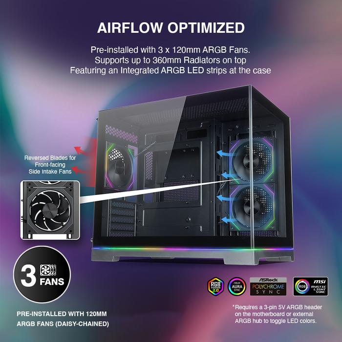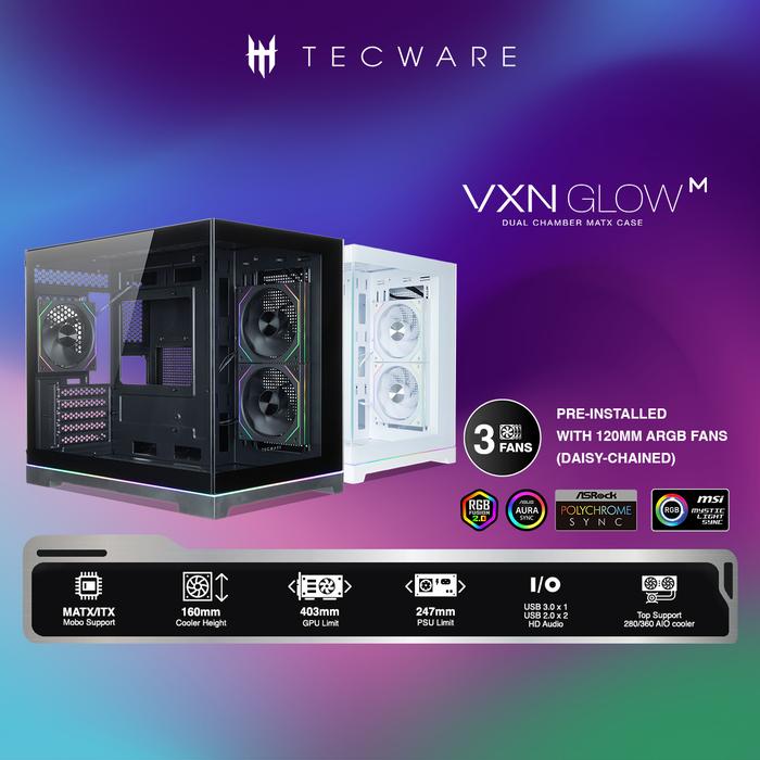 Tecware Vxn Glow M Dual Chamber M-Atx Case Tempered Glass | Casing Cpu Komputer Gaming Free 3X Fan Argb Hitam Putih - Hi