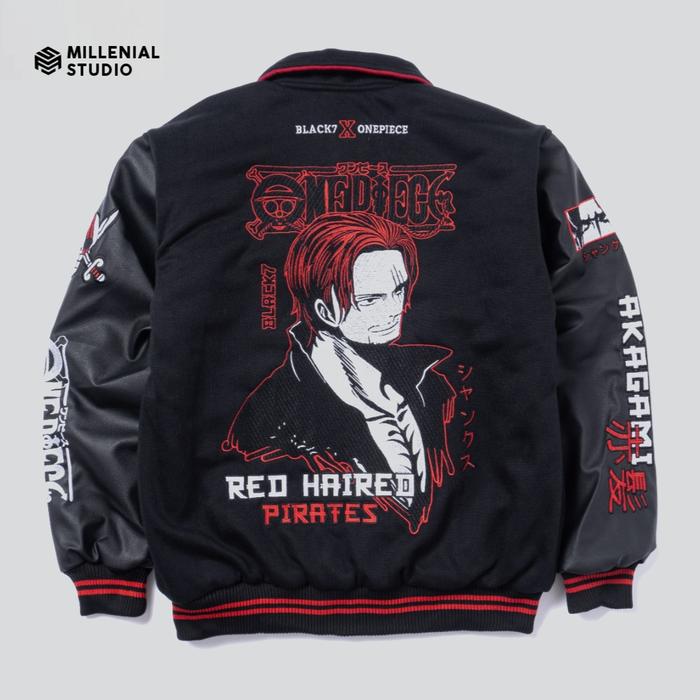 VARSITY JACKET ONE PIECE AKAGAMI NO SHANKS HITAM JAKET BASEBALL BORDIR ORIGINAL UNISEX Lembut Nyaman