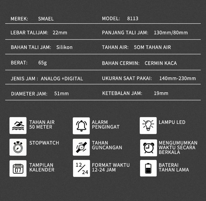 Jam tangan sport pria analog digital tahan air 50 meter Merk SMAEL 8113