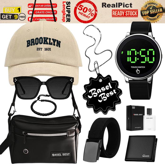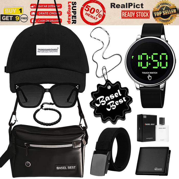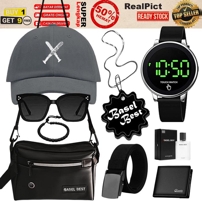 Bundling 9in1 Subana Padiah Asesoris Pria Ganteng Jam Tangan Touch Watch Digital Free Topi + Tas