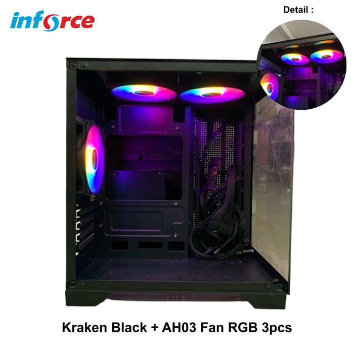 Inforce Pc Gaming Case Kraken Black White Tempered Glass + 3 Fan - Hitam