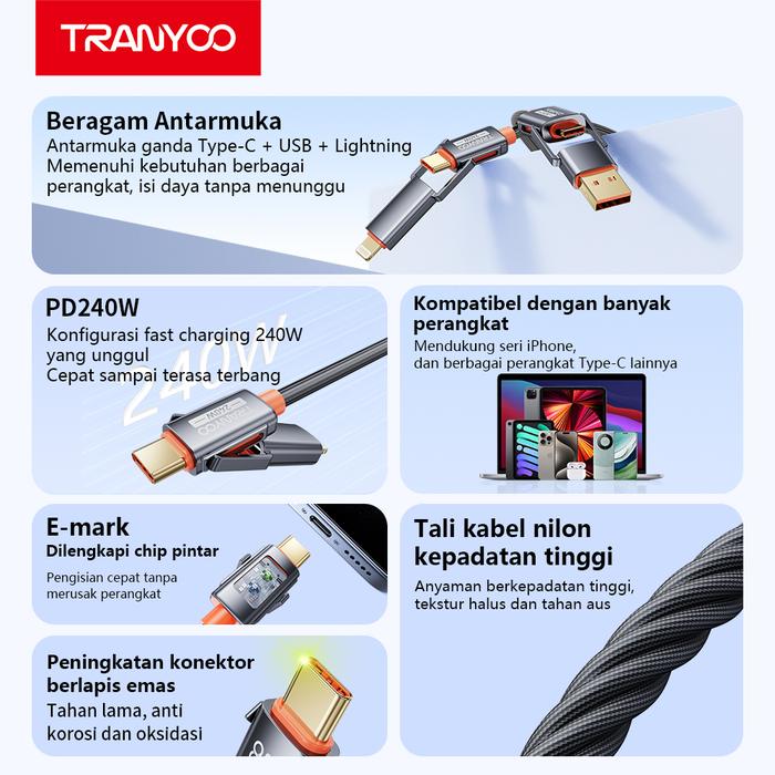 Tranyoo T-Xs10 Kabel Data 4 In 1 Pengisian Cepat Pd 240W Fast Charging Cable Charger Type-C Dan Lightning Usb-C Multifun