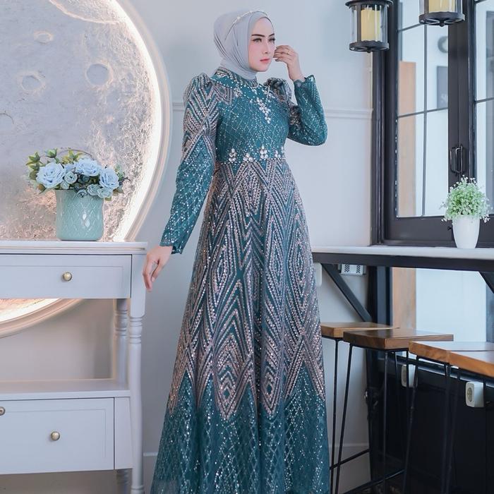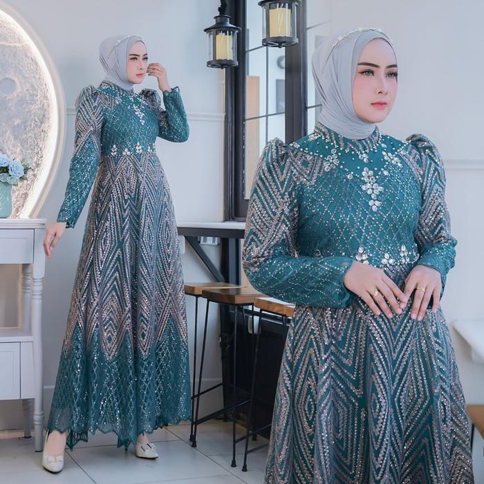 Kemilau Official Gaun Mizel All Size Ld 108 - Dress Wanita Busana Kondangan Pesta Brukat Premium Mix Bordir - Navy