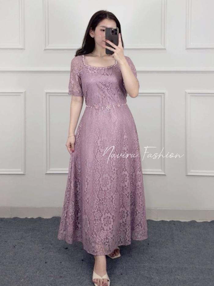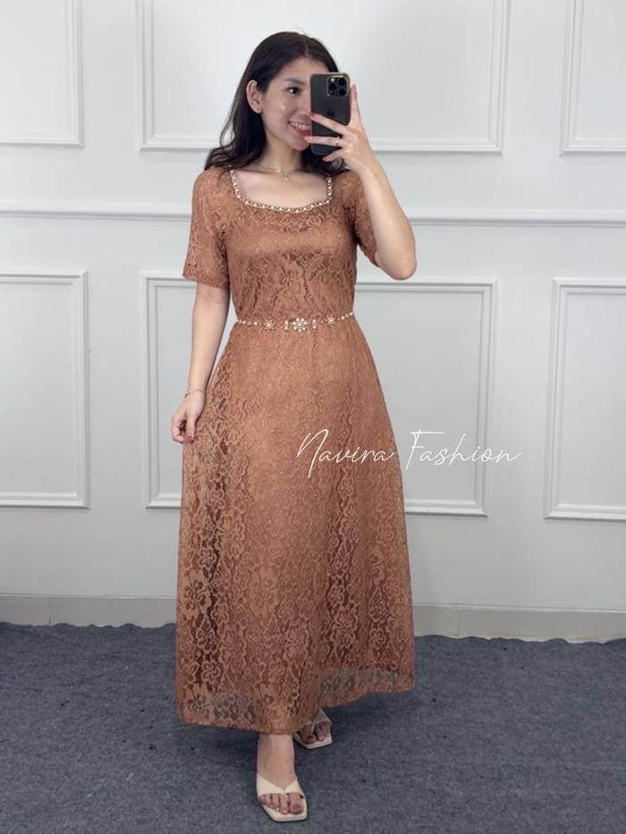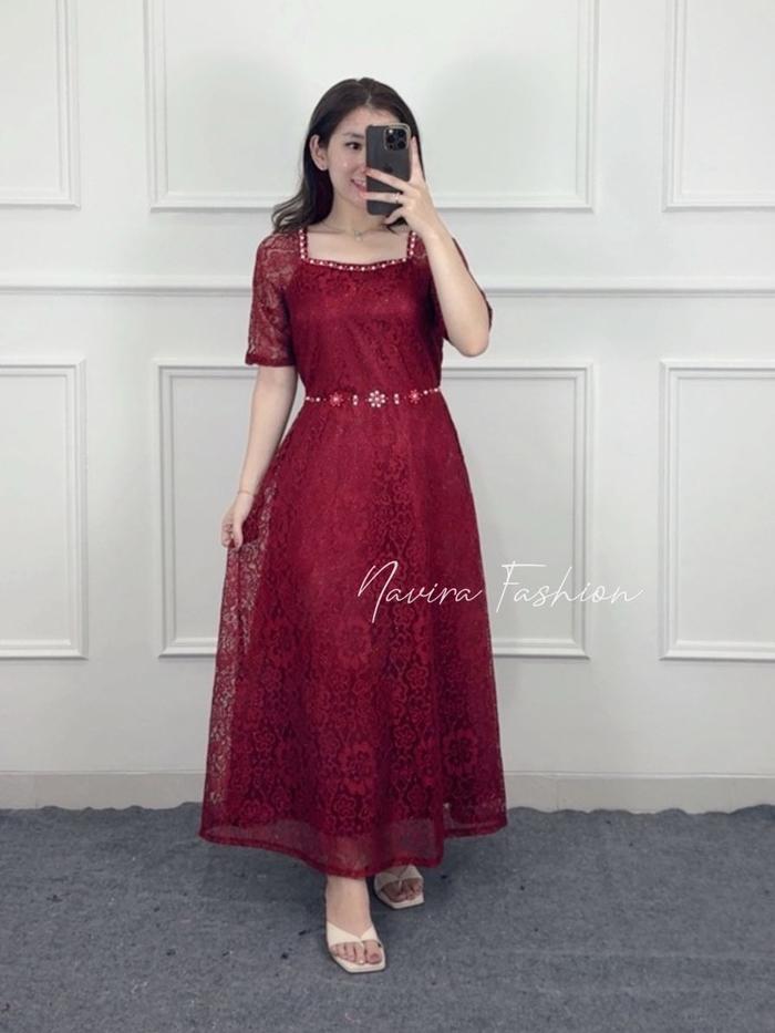 Navira - Caren Dress New Motif - Dress Brokat - Dress Pesta - Dress Kondangan - Long Dress - Maroon, M