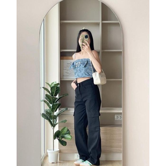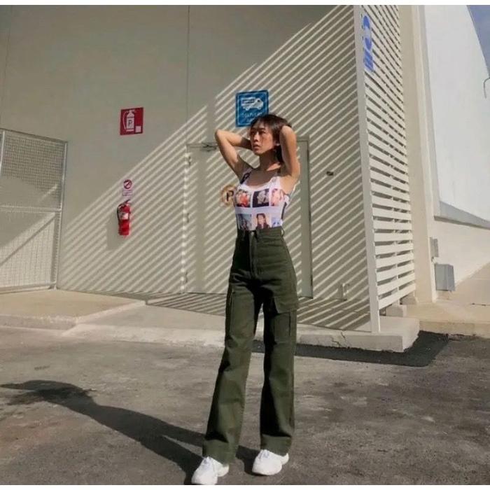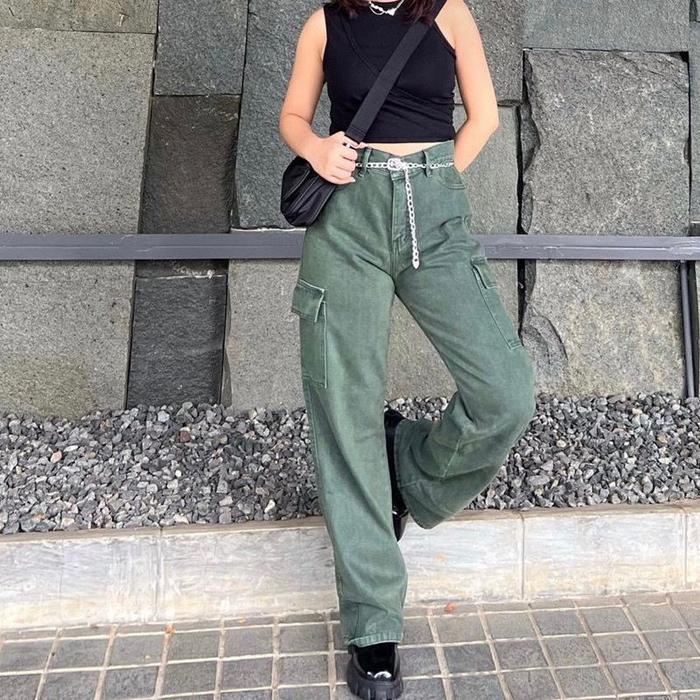 Celana Jeans Cargo Kantong Samping Hight Waist Baggy Bawahan High Panjang - Abu, 27