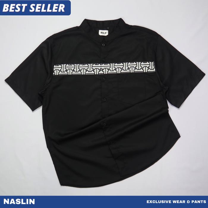 Baju Kemeja Koko Pria Naslin Lengan Pendek Motif Kobata Kombinasi Batik Warna Hitam Navy Putih Abu Misty Bahan Katun Toy