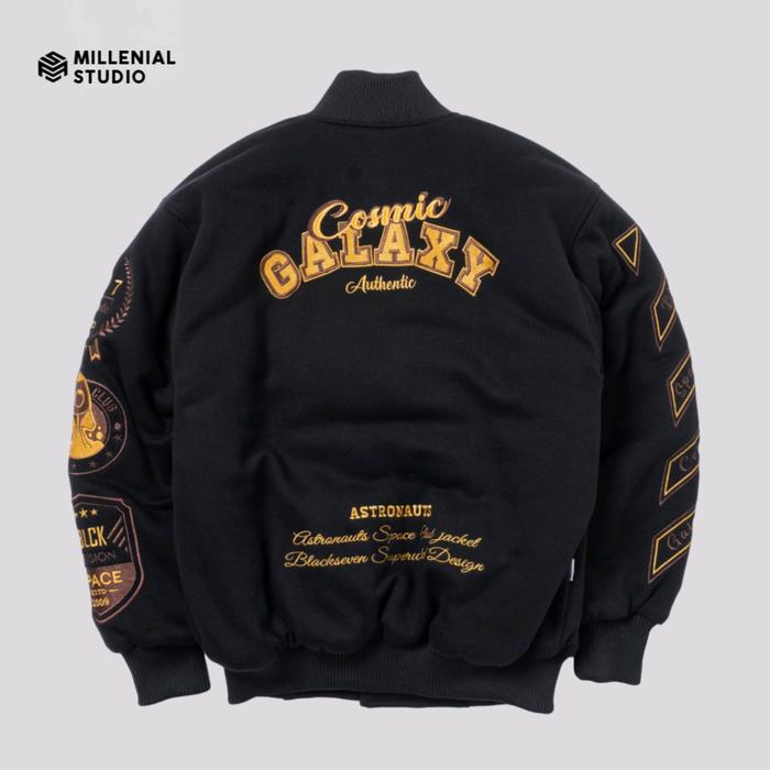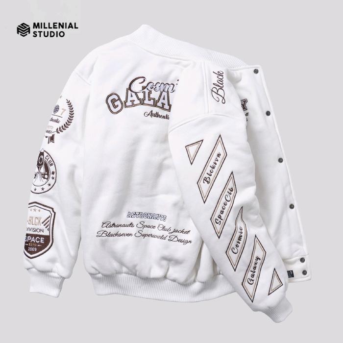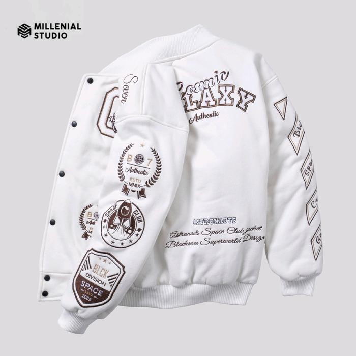 Varsity Jacket Cosmic Galaxy Full White Black | Jaket Baseball Cotton Fleece Bordir Original Unisex Lembut Pria Wanita B