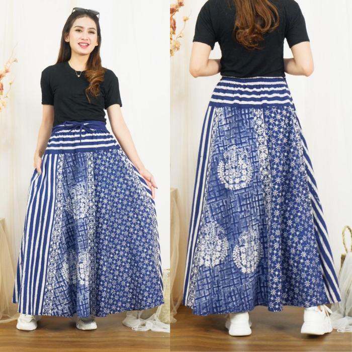 Rok Batik Indigo Pinggang Karet Bahan Katun Premium Rok Wanita Jumbo Terbaru - Seling Salur