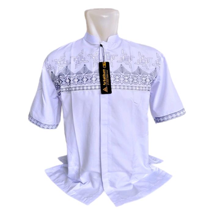 Baju Koko Putih Pria Dewasa Motif Bordir Montana Lengan Pendek Arfathan Arf031 - Pakaian Muslim Pria Bahan Katun Lembut