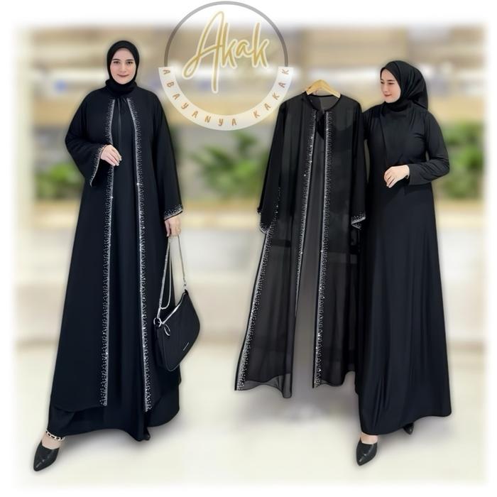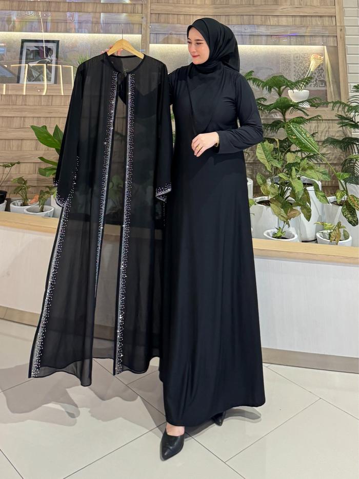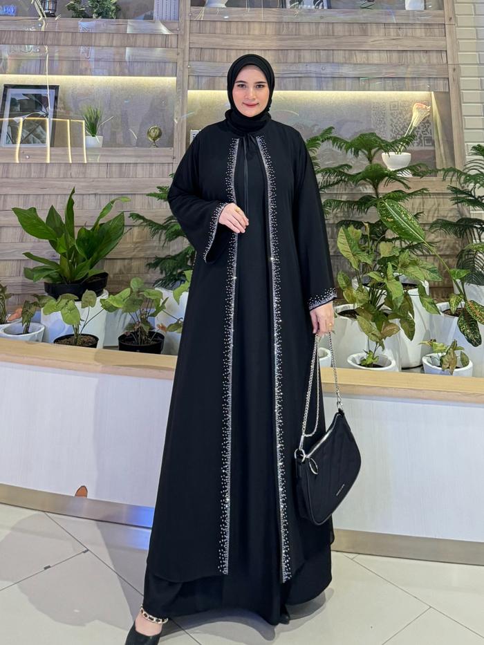 Best Seller Abaya Turki Outer Lepas Pita Terbaru Bordir Mote Import Mewah Muslim Gamis Wanita Hitam - Kombinasi Dres