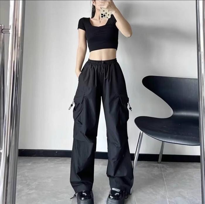 Unisex - Celana Cargo Serut Unisex - Celana Skena Gombrang Highwaist - Celana Cargo Terbaru Cantik - Hitam, Petite M