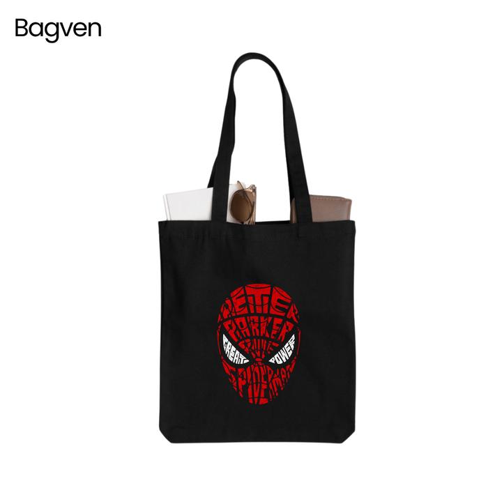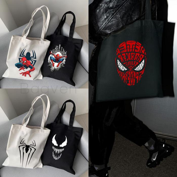 Tas Tote Bag Motif Spider Man Resleting Kanvas Totebag - Sp 01 Hitam, 27X37Cm