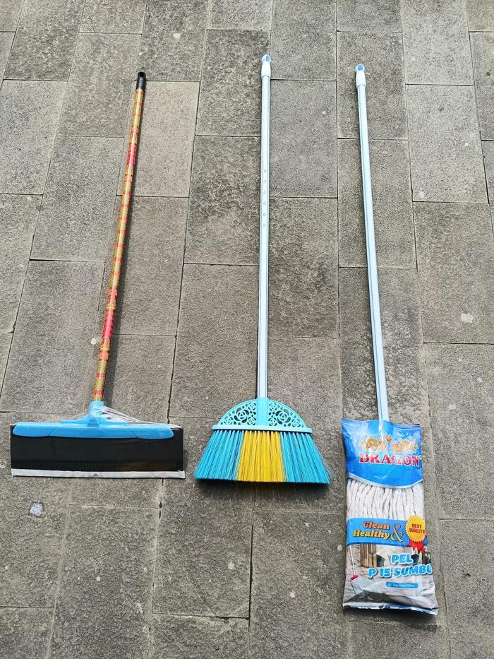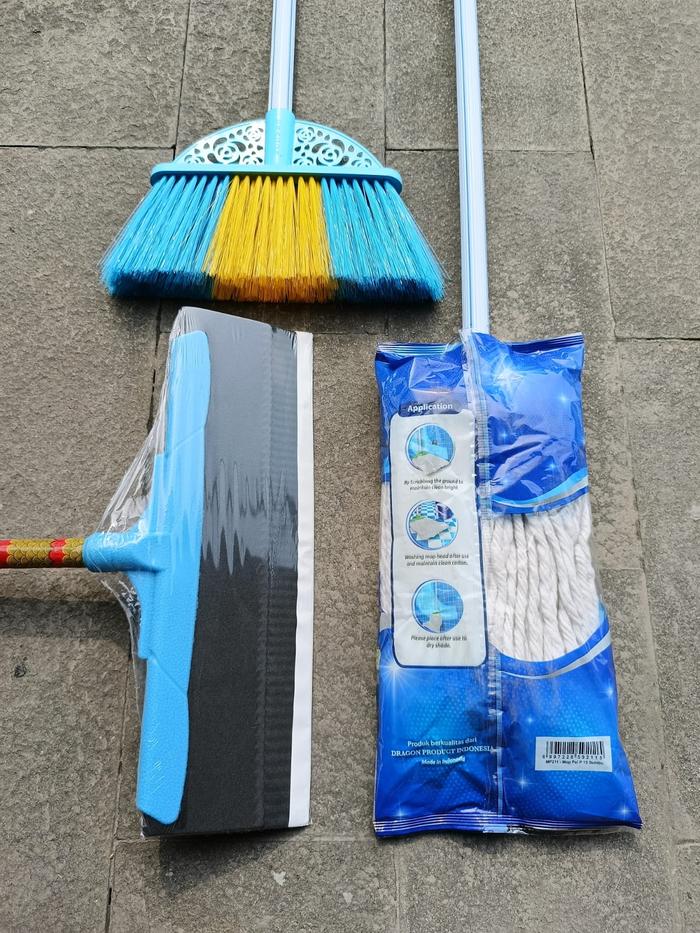 Paket Sapu 3 In 1 New Sapu Batavia Pel Dragon Wiper Gagang Kayu Lantai Plastik