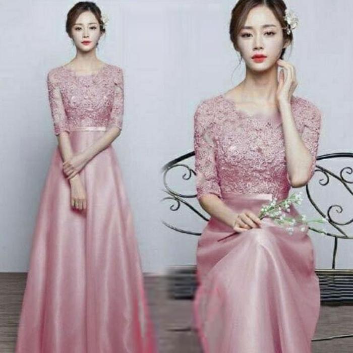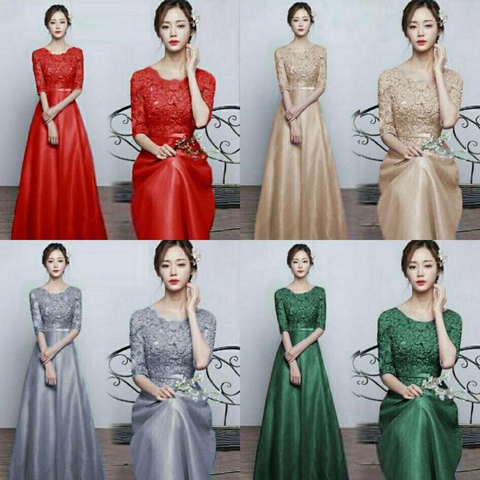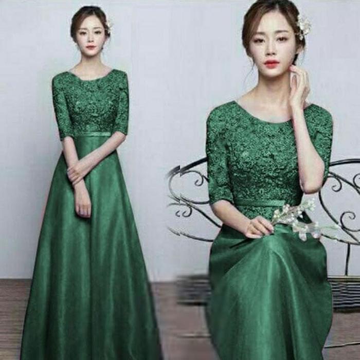 Okano Fm- Dress Pesta Brukat & Saten Gaun Wanita Longdress Dengan List Pita Di Ikat Pinggang Ukuran M L Xl Xxl Bahan Bru