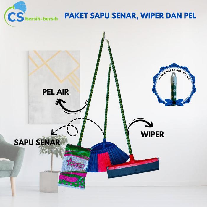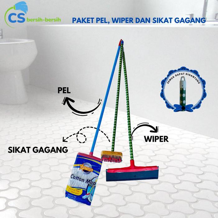 Paket Hemat Alat Kebersihan Set 3 In 1. Pel,Wiper, Sikat Gagang Dan Sapu Senar - Paket Pel, Wiper Dan Sikat Gagang