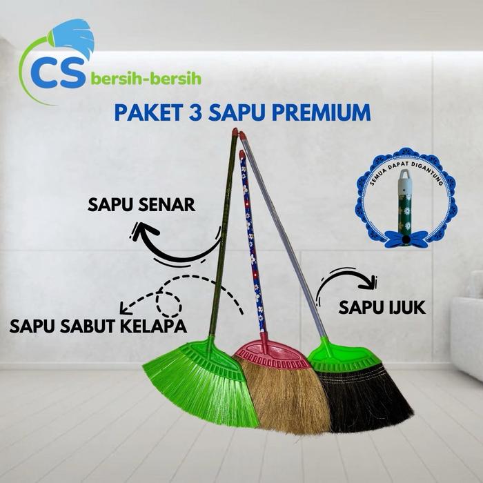 Paket 3 Buah Sapu Lantai Rumah Sapu Ijuk Scorpion,Sapu Senar,Sapu Sabut Kelapa Gagang Kayu Dan Fiber - Sapu Ekonomis 3