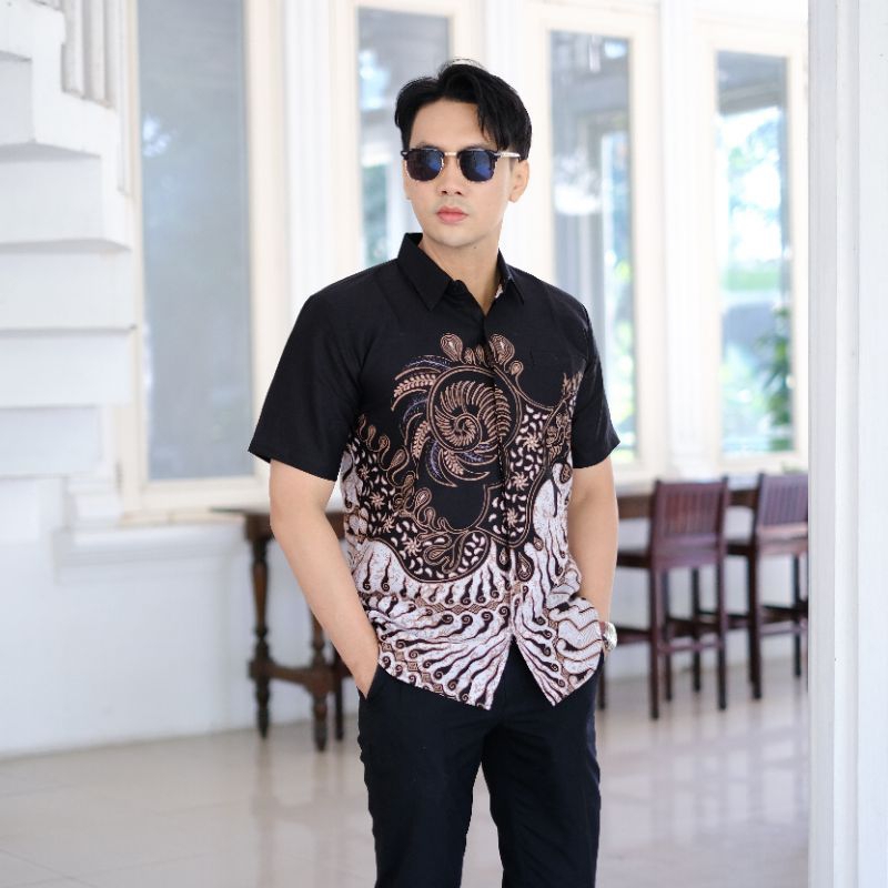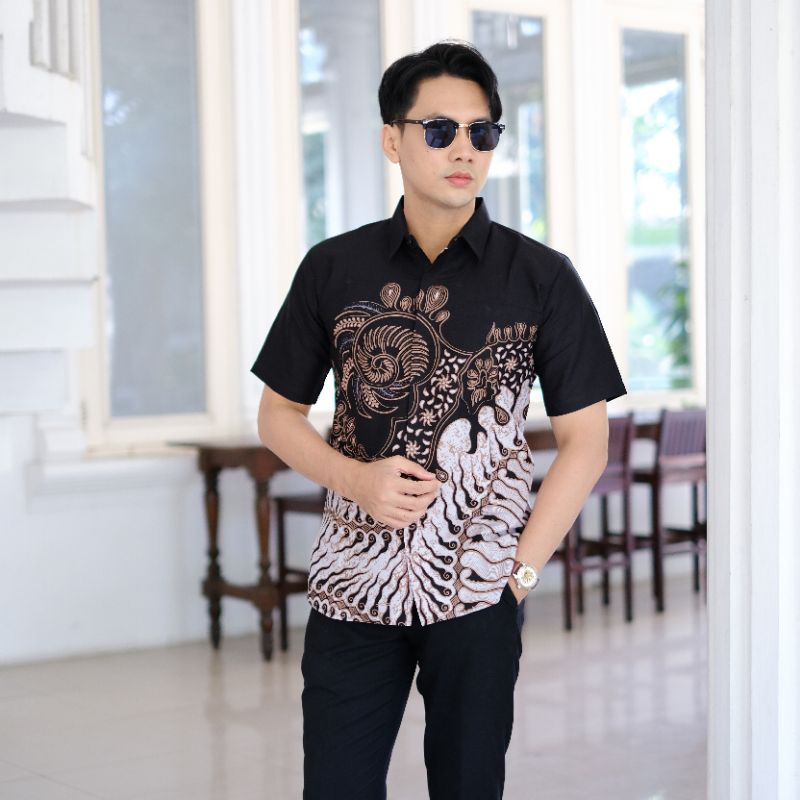 Motif Rangkong Hitam Lengan Pendek Kemeja Batik Pria Slimfit Lengan Pendek Lapis Furing Hem Batik Pria Jumbo