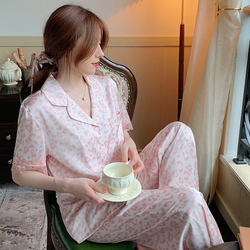 002 Ultra Luxury Sleepwear Kelas Atas Piyama Satin Lengan Pendek Celana Panjang Lengan Bunga Kancing Hidup Bahan Satin H