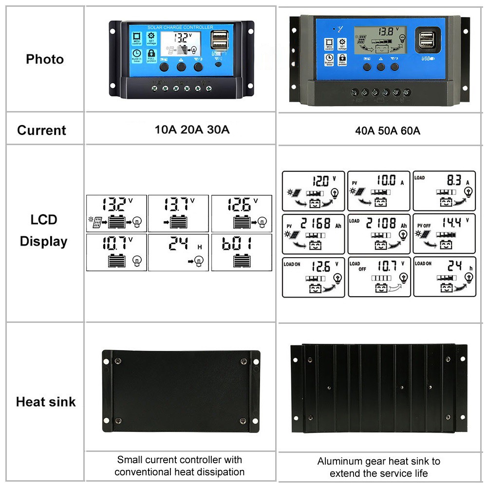 Solar Charge Controller LCD LED Display Solar PWM 12V/24V 10A 20A 30A 50A 60A USB Panel Surya Charge