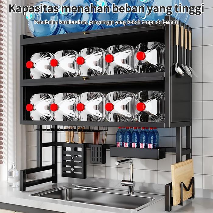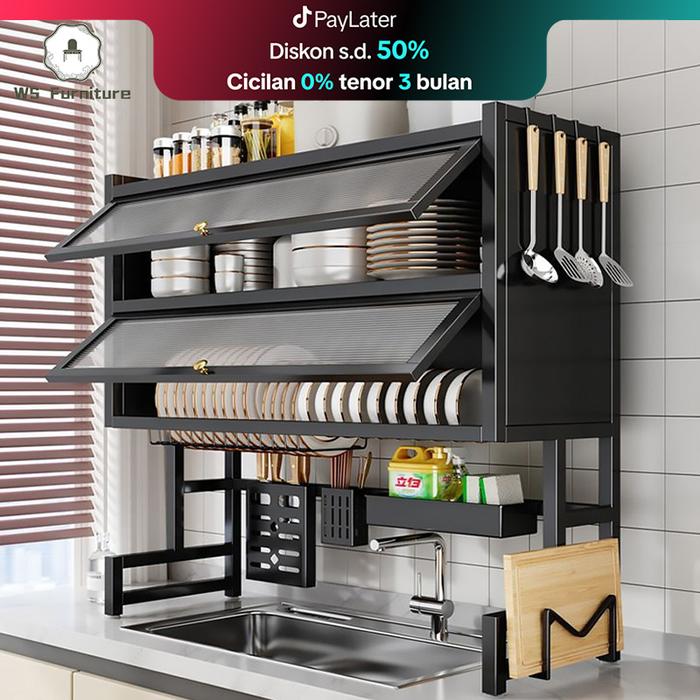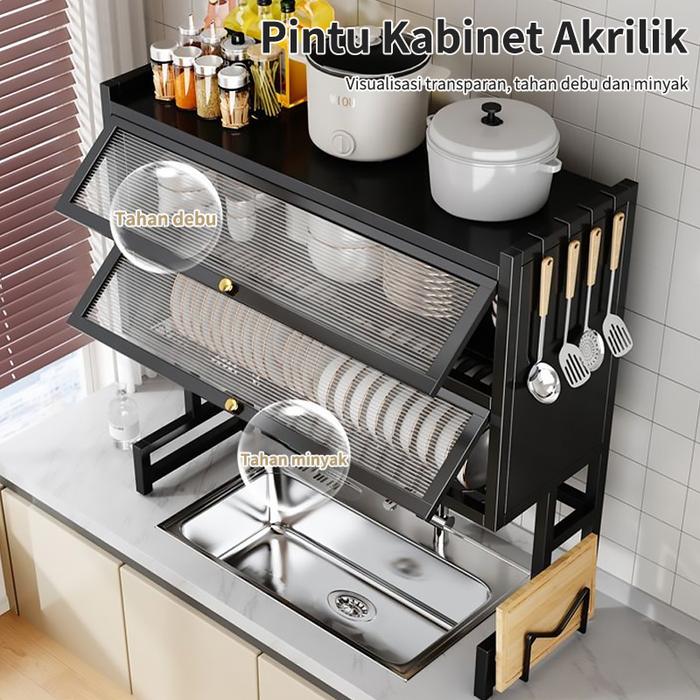Ws Furniture Rak Piring Wastafel 2 Susun Dengan Kabinet & Aksesoris 4 Kait 65Cm-105Cm Baja Tahan Karat Multifungsi Dapur