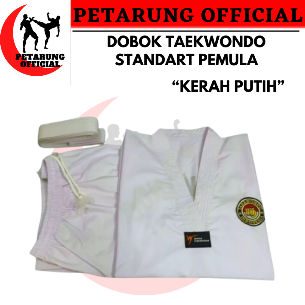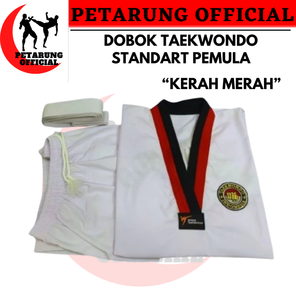 DOBOK TAEKWONDO , DOBOK STANDART PEMULA , SERAGAM TAEKWONDO KERAH HITAM , KERAH MERAH , KERAH PUTIH