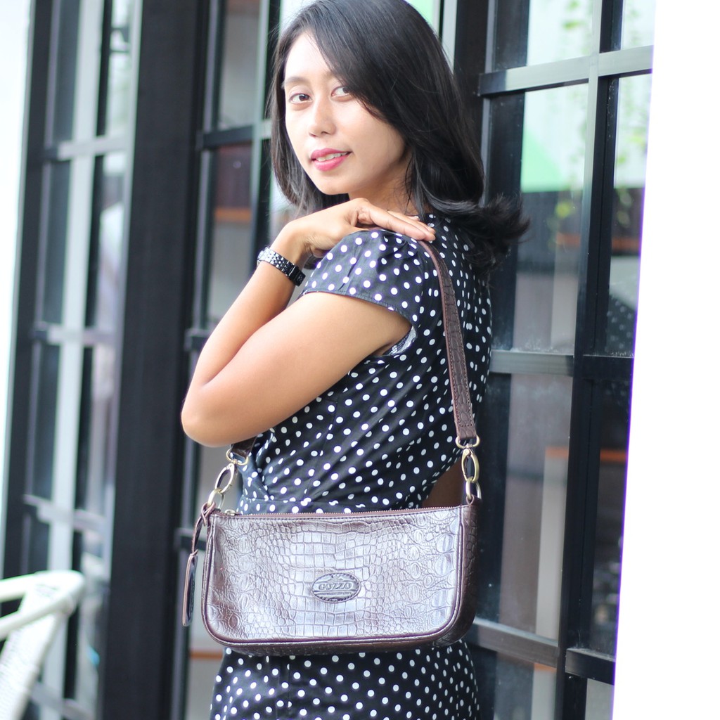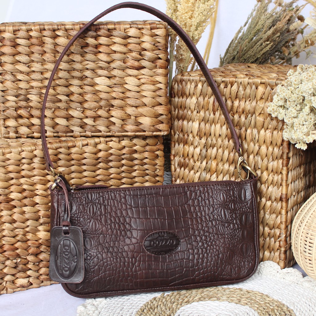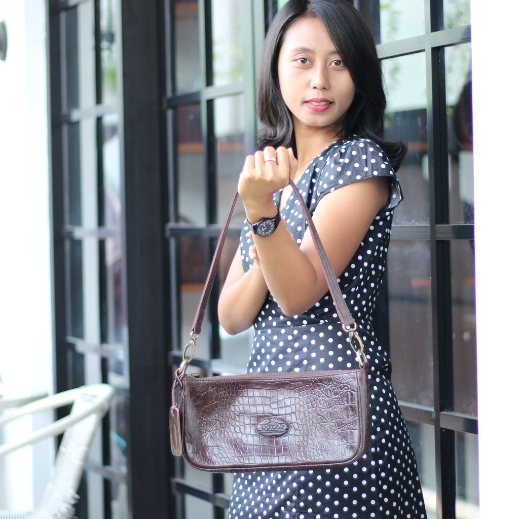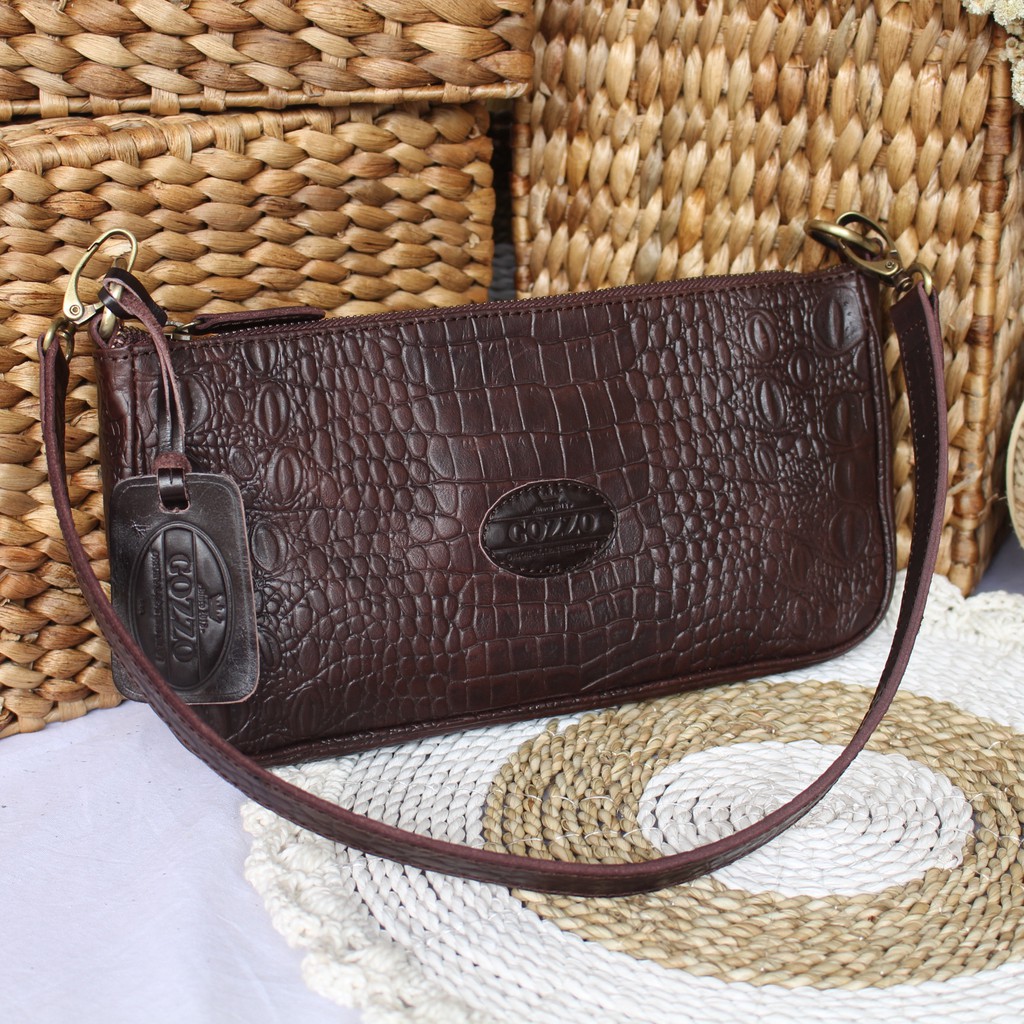 TAS TANGAN / CLUTCH WANITA KULIT ASLI EMBOS CROCO NEBULA COKLAT TUA / FREE GRAVIR NAMA DI TAS