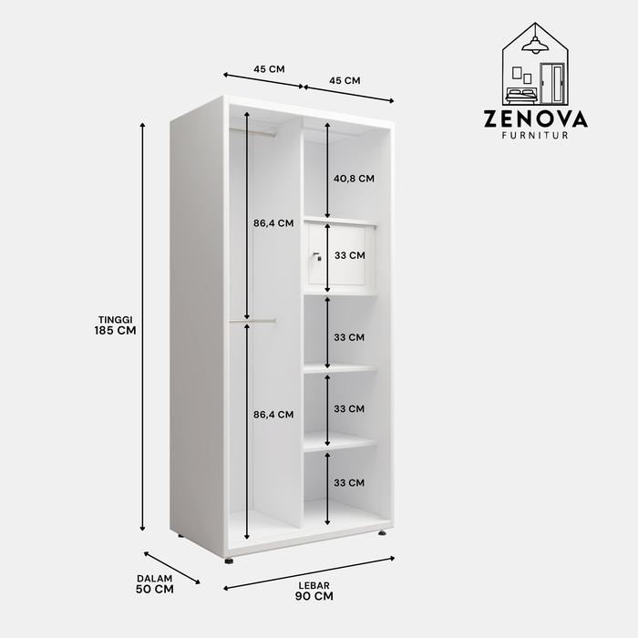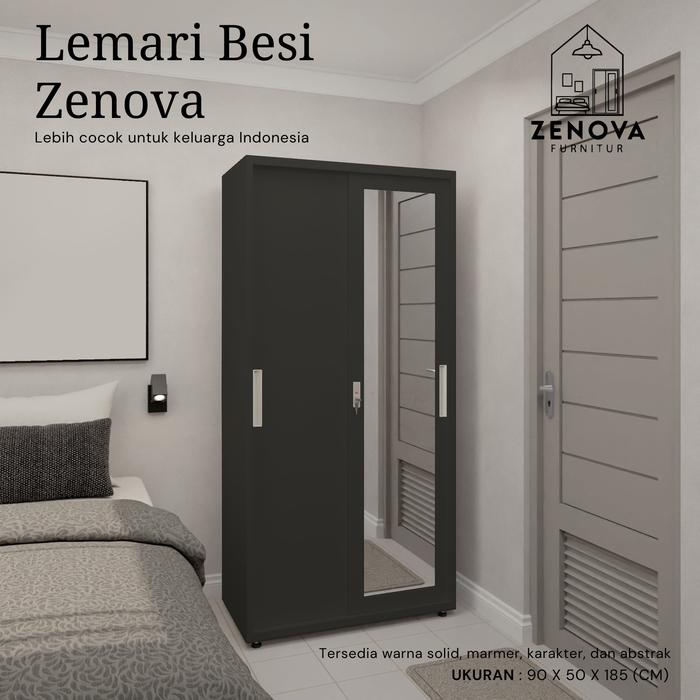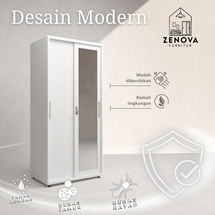 Zenova Lemari Pakaian Besi Sliding 2 Pintu 90Cm Dengan Cermin & 2 Gantungan Baju Minimalis Kamar Tidur Tahan Karat Anti
