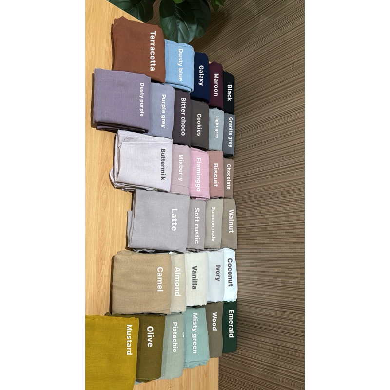 Black, Galaxy, Maroon, Olive, Misty green, Dusty blue, Coconut, Buttermilk, Mixberry, Vanilla, Almond, Walnut, Chocolate, Biscuit, Latte, Granite grey, Flamingo, Terracota, Ivory, Pistachio, Camel, Bitterchoco, Summernude, Cookies, Dark Coco(C.Pramuka), Soft rustic, Wood, Light grey, Mustard, Soft purple, Purple grey, Berry maroon, Taro, Emerald, Tan, Soft peach, Butter cream, Cocoa, Coughat, Yogurt, Smoke green