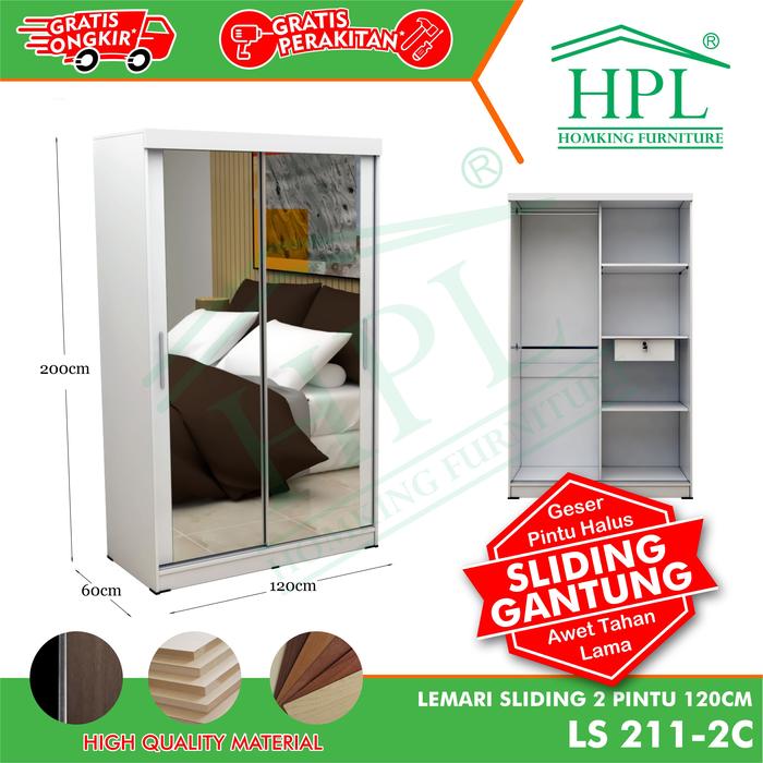 Lemari Pakaian Hpl Sliding Cermin 2 Pintu 120 - Putih Glossy