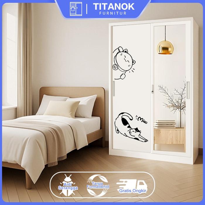 Lemari Titanok- Lemari Pakaian Besi 2 Pintu Slidding 90Cm Wardrobe Steel Cermin MinimalisG - G01, 1