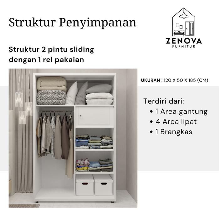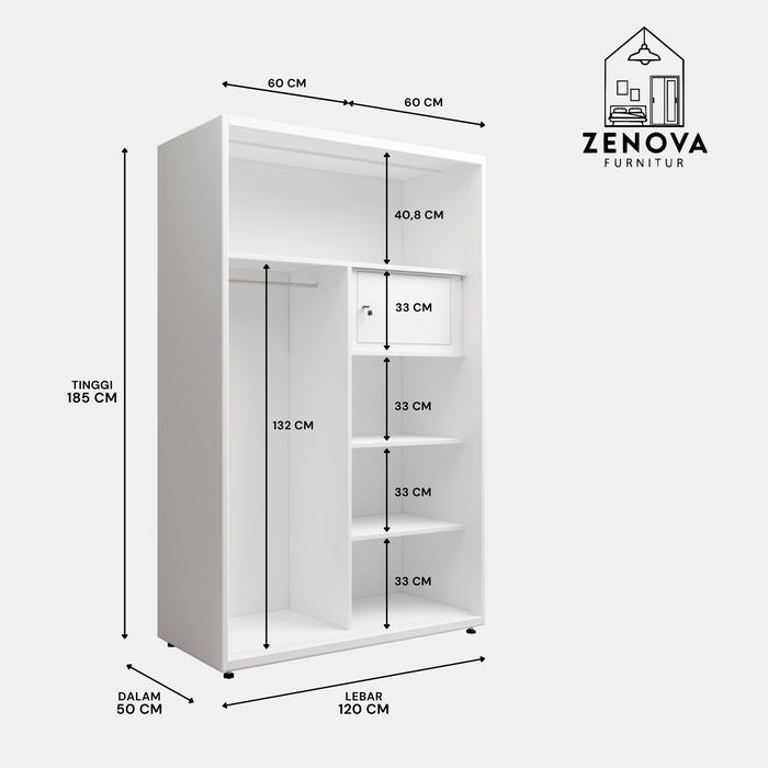 Zenova Lemari Kamar Tidur Besi Sliding 2 Pintu 120Cm - Pintu Geser + Cermin Panjang & Gantungan Anti Karat Kokoh Minimal