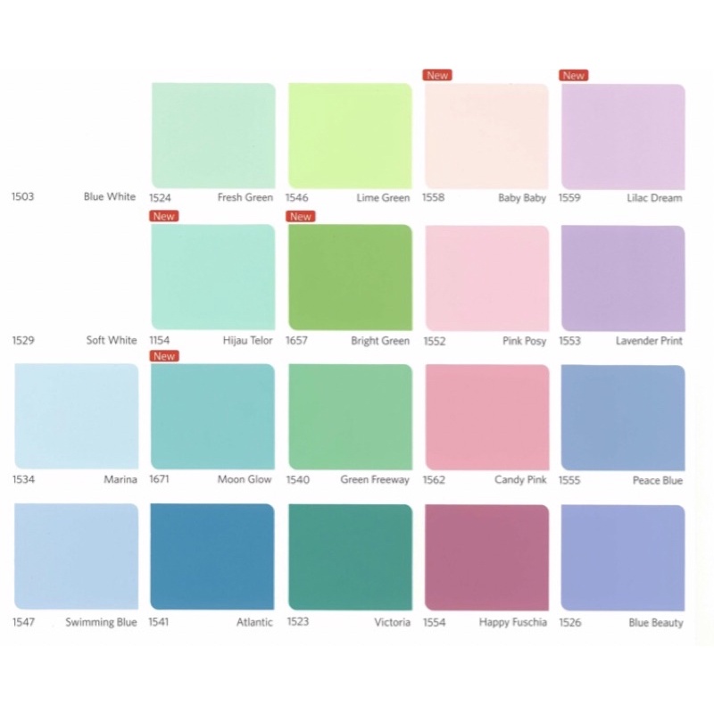 1505 White, 1553 Lavender Print, 1546 Lime Green, 1509 Lily White, 1518 Cream, 1555 Peace Blue, 1547 Swimming Blue, 1557 Sunshine, 1540 Green Freeway, 1131 Orange Torch