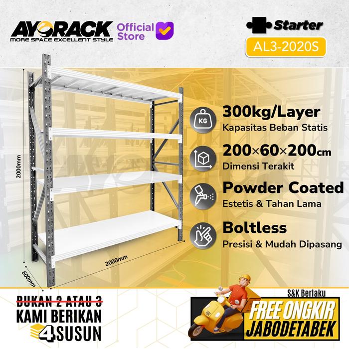 Rak Gudang Besi 4 Tingkat 2 Meter Ayorack Al3-2020S Light Duty 300Kg - Starter