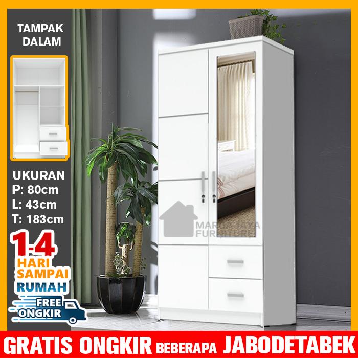 Lemari Pakaian 2 Pintu Kaca Laci Hitam Minimalis Modern - Putih, Belum Dirakit