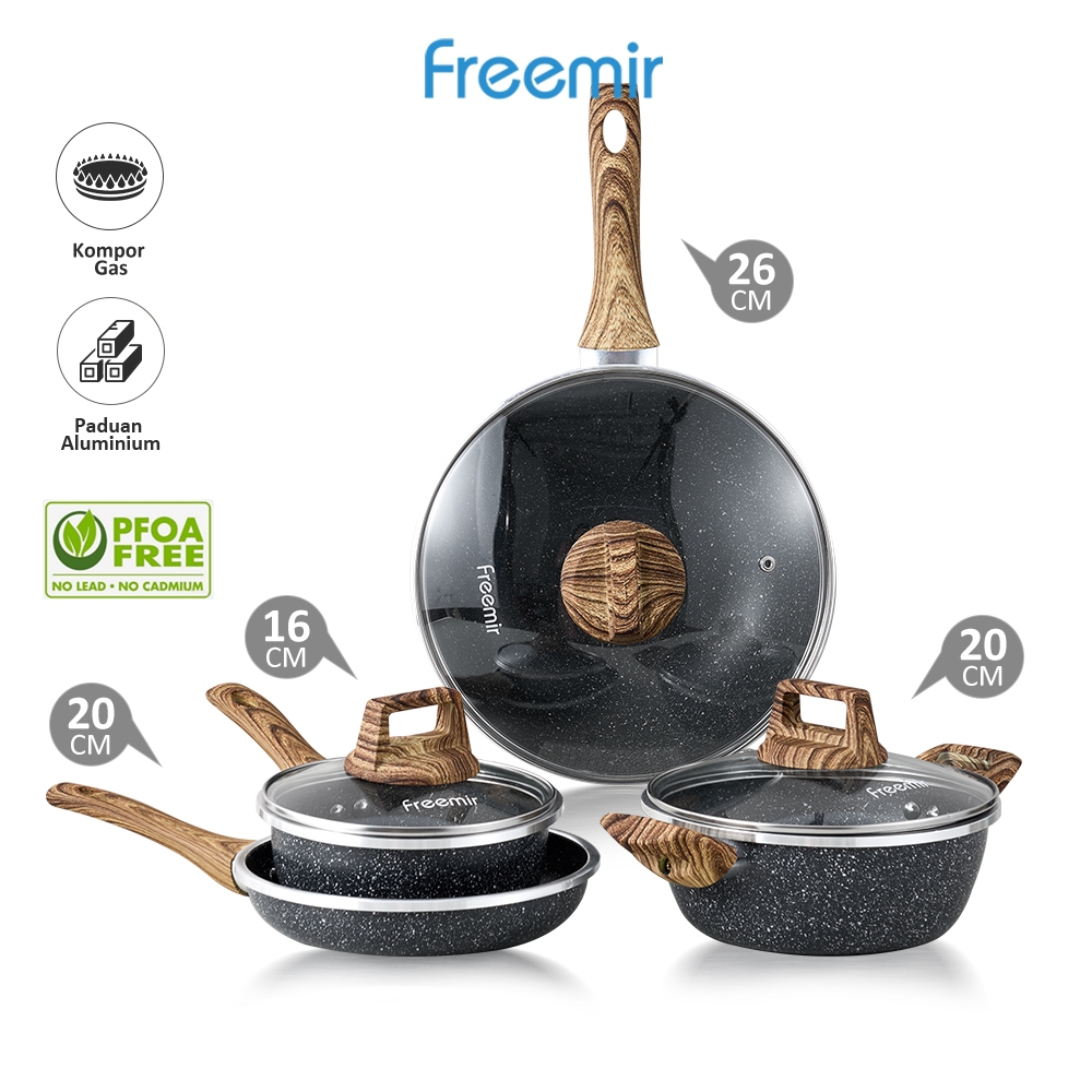 freemir Set 7 Pcs Wajan Panci Ukuran Lengkap dengan Tutup Anti Lengket Marble Lapisan Granit