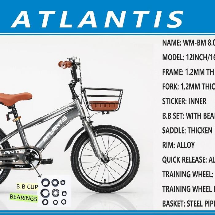 Sepeda Anak Laki Bmx Atlantis Bm 8.0 Ukuran 16-18 Inch Dengan Keranjang Depan New - Grey Bm 8.0, 12 Inch