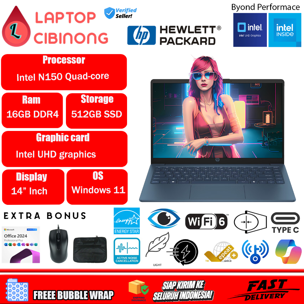 Laptop Hp 14 Series Intel Quadcore N150 Ram 16GB Windows11 Office 2024 Water Blue