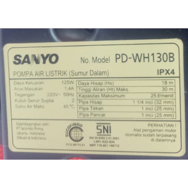 Sanyo PDWH 130 B Pompa Air Sumur Dalam Non Otomatis